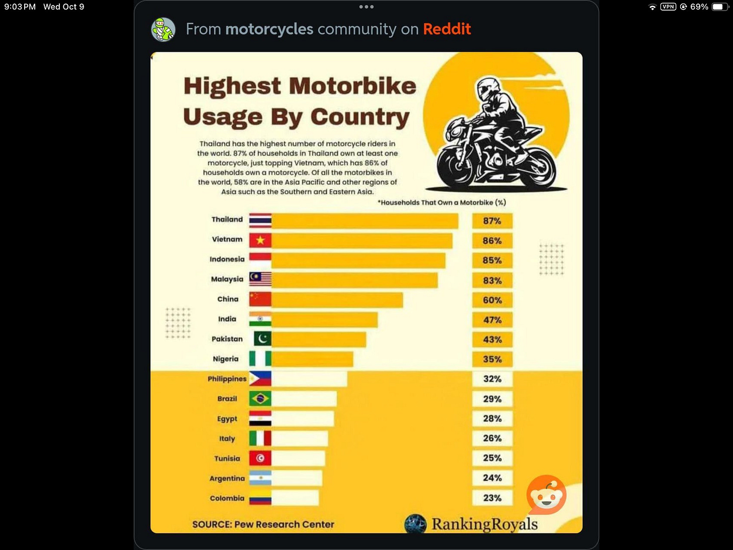 For every car you see on the road, there must be at least a hundred motorbikes zipping around like they have places to be. As a recent post on Reddit pointed out, Thailand is the place to be if you want to travel around on a powered set of two wheels.